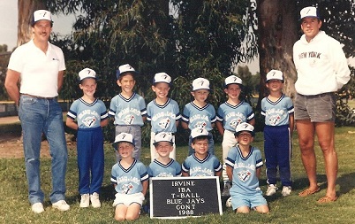 Maybe I should have been paying closer attention to my dear Mother, because next thing I knew I was being dropped off at a small baseball field and told I was going to be playing for the Blue Jays. I recognized my classmates Brent, Sam, Nathan, Chris and Erik, but didn’t understand what we were all gathered for outside of school. As an example of how little I cared, the group of kids above is actually my team, but I am not in that photo! Apparently I couldn't even be bothered to throw on a hat and jersey, but back to the field. Soon Erik and Chris’ dads were telling us to line up for batting practice. Lining up I could do, but after that I was completely lost. Hitting a ball had something to do with it, I knew that from watching Wally Joyner in-between bites of Ballpark franks, but there was no pitcher to be found.