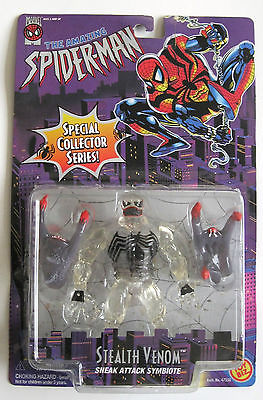 The final version of Venom in this era was "Stealth Venom". It was actually just a Venom II packaged with the mask on and adding some weird snap-on alien claws, partially translucent hands and a clear tendril rope wrapped around his abs. I used to own the variant version of this where the figure was totally see-through, but sold it a few years back during one of my collector "purges". This was released at the height of the collector's market as confirmed by the "Special Collector's Series" burst on the card. The box art also tells us that this was produced in the brief period where the Spider-Clone, Ben Reilly took over for Peter Parker and made himself a new costume as the Sensational Spider-Man. The 90's were a wild time for Spider-Man fans, let me tell ya.