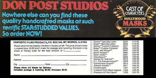 They say a picture is worth a thousand words, well this ad from a 1985 issue of Fantastic Films magazine has gotta be good for at least 1,500. What's being presented is a series of sci-fi and classic horror inspired rubber masks from a company called Don Post Studios, who obviously took the art of crafting latex character masks seriously. Every inch of this ad is amazing, so let's take a closer look and see what all the fuss is about.