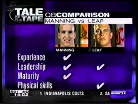 After finishing third that year in Heisman voting, Leaf decided to forgo his senior year and final year of NCAA eligibility to enter the NFL Draft. With fellow college quarterback Peyton Manning from the University of Tennessee also entering the draft, Leaf soon found himself along with Manning being hotly discussed by analysts over who was the better prospect and who should be taken before the other. The Indianapolis Colts and the San Diego Chargers were the first two teams in the draft that year, and both were looking to draft quarterbacks, so this made the discussion even more intense, with almost all draft related media being focused on the two prospects. Manning was seen as the more NFL ready of the two, while Leaf was seen as the one who had far more potential.