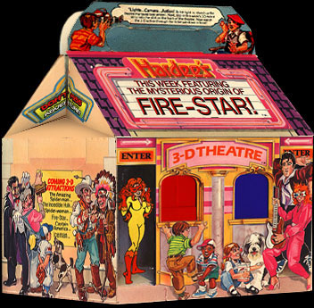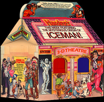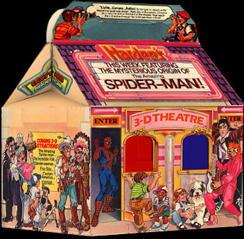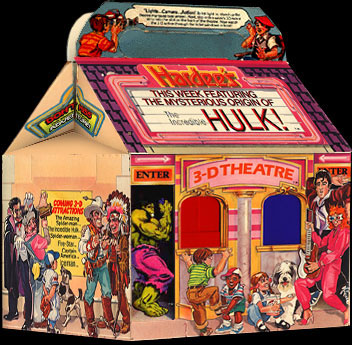 Each meal featured a 3-D built-in theatre in the box to view the mini 3-D comic strip of each hero as a prize.