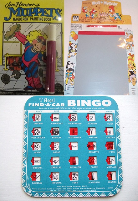 One of my favorite selections were activity books that came packaged with a clear tipped pen that when applied to the paper revealed numbers, images or text hidden in the page. The “magic” of making the trivia answer appear was always a thrill, until the clear liquid ran out. Am I the only one that remembers these things? Another simple device that provided hours of fun was the Magic Slate drawing which always had a familiar character at the top promising fun. If all else failed I could always fall back on Car Bingo, though my version of the game mostly involved flipping the red plastic tabs back and forth repeatedly.