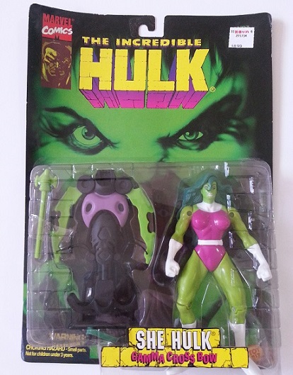 "Shulkie" was originally imagined by Stan Lee as a Dr. Jekyll/Mr. Hyde type character in the Savage She-Hulk, but by the late 80's writer/artist John Byrne re-defined the jade giantess in the pages of Sensational She-Hulk (and prior to that, Fantastic 4) as a clever heroine, with a fantastic sense of humor who embraced her powers by staying in She-Hulk form 24/7. This is She-Hulk's first action figure ever as inspired by her appearance on the 90's Hulk cartoon, where the voice actress really brought the character to life in a wonderful way.