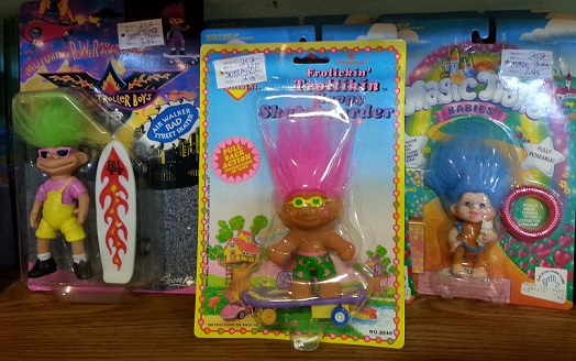 Here we have 2 dueling skateboard themed Trolls with names like Frolickin Trollickin Happy Skateboarder and Troller Boys (which is actually pretty clever), right next to a Magic Trolls Babies doll that came with a charm bracelet. Each is there own brand of crazy, with the wild plume of colorful hair the only common requirement needed to be called a Troll. By that logic, Yahoo Serious from Young Einstein or Cosmo Kramer from Seinfeld could have justified their own brand of Troll toys.