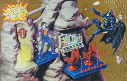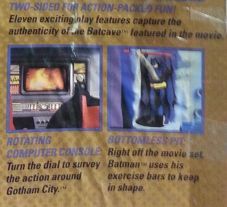 The point at which I realized that the Toy Biz people had no integrity, but a fantastic sense of humor was this glorious image and accompanying text, "Bottomless Pit: Right off the movie set, Batman uses his exercise bar to keep in shape." If you are not currently busting a gut, we can't be friends. Toy Biz is claiming that Batman does pull-ups over an endless abyss to stay in shape sometime during the film's run time and we just missed it. Let's not forget that the word "authenticity" was part of their pitch just 6 inches above this complete lie and I love them for it.