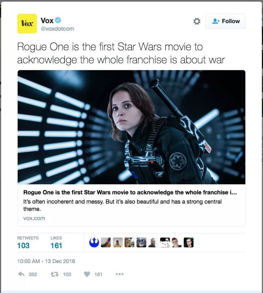 Yeah, everyone's saying that Rogue One puts the "WAR" back in Star Wars.