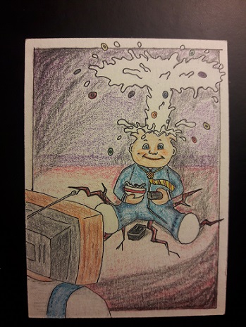 It's a play on the classic Blasted BILLY/ ADAM Bomb. Only exploding cereal instead of..well..explosions. Also, he is watching what i presume to be cartoons on Tee Vee STEVIE.