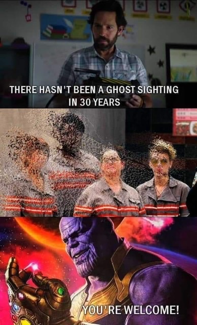 I saw a meme image on Facebook yesterday of Paul Rudd's character mentioning the fact that a ghost hadn't been sighted in 30 years, and then the 2016 lady Ghostbusters being "snapped" out of existence by Thanos.