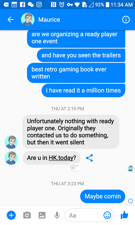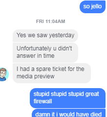 I have been anticipating this movie with bated breath. Then the worst thing of all time happend to me 2 days ago. So I currently live in China and Have Helped throw some Retro Gaming Cons in Hong Kong. Well 2 days ago I got a message on my phone from the owner of a shop in HK called Otaku games and one of the main organizers of the Con. He asked if I was coming to Hong that Day. I responded yes. however, unbeknownst to me, My phone didn't really send the message. You may know that 80 percent of the internet in Mainland China is blocked. We use VPN'S to hack over the Great Firewall. They aren't reliable sometimes.