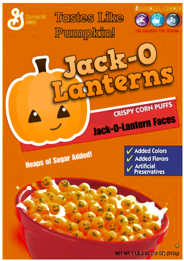 Shaped like kix but it's orange and has jack o lantern faces on it and tastes like pumpkin pie. |